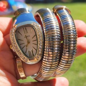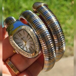 Elegant coiled watch featuring gold and silver tones. Crystal accents add a touch of sparkle.