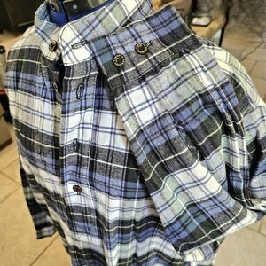 The Vermont Country Store Blue Plaid Button-Up Night Gown. Features a comfortable fit one size and classic design with front buttons. L 48.5 Shoulder 21.5 W 24.5