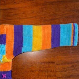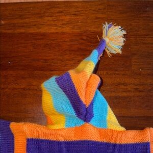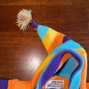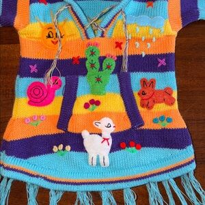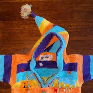 Absolutely precious 100% wool sweater with fringe at bottom and at hood tip. Puffy rain clouds, bunny rabbits, lambs, snails and flowers adorn the front and back of the sweater. No holes or tears.