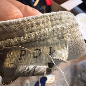 This pre-owned women's tunic top by POL, size M, features a sage green color with a high neckline and a sleeveless design. The front yoke is adorned with intricate purple floral embroidery and white lace trim. A gold-toned zipper closure runs down the back. The fabric appears to be a soft, possibly knit, material with a relaxed, flowing fit. There are no significant visible imperfections, though some loose threads are present on the brand tag.