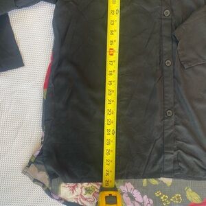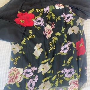 Beautiful mixed-media button-down blouse by Kaktus, new with tags. Features a solid black front and sleeves with a stunning sheer floral chiffon back panel. Perfect for layering, workwear, or casual chic looks.