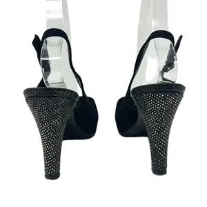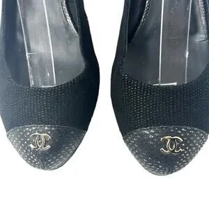 Step into timeless Parisian elegance with these Chanel black tweed slingback heels featuring a signature CC logo cap toe in shimmering gold speckle finish. Crafted in a sophisticated closed-toe silhouette, they combine the classic Chanel slingback style with luxe texture and statement detailing.