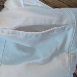 Chic white denim jacket with button front. Features two chest pockets. Ideal for layering.