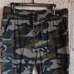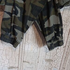 Stylish camo cargo pants. Features multiple pockets. Elastic cuffs for comfort.