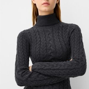 Elegant black cable knit dress. Features a cozy turtleneck. Perfect for cool weather.