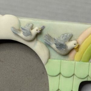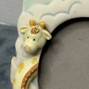 The Harvest Moon Noah's Ark photo frame is a charming tabletop decor piece suitable for the nursery or any occasion. This multicolor resin frame features a rectangular shape with art deco style, perfect for displaying a 3.5x4.5 photo. The rear-loading design allows for easy photo insertion, while the free-standing mounting makes it versatile to place anywhere. Handmade and manufactured between 2000-2009, this photo frame is a unique collectible piece that adds a touch of whimsy to any room.