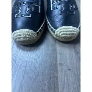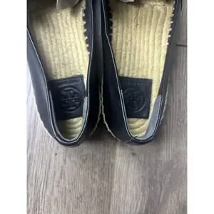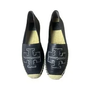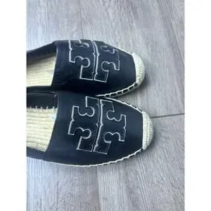 Tory Burch Espadrille Flats Black Leather Logo Size 8.5 Casual Slip On