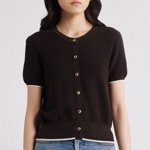 Perfectly chic as a sweater or a top, this tipped cardigan is knit from a lightweight cotton blend with short sleeves and glossy goldtone buttons.
