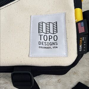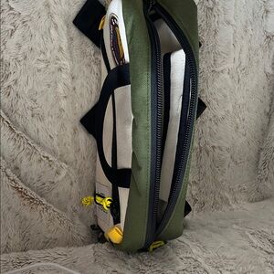 Like new, never used, cream and green belt bag by Topo Designs. Features durable construction and convenient front zipper. Adjustable waist/shoulder strap, can be worn crossbody or as a fanny pack. Coated cordura material and heavy duty zippers. 13.25” L x 8”H