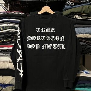 Bold black long sleeve tee with striking white graphic design. Ideal for casual wear.