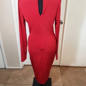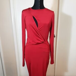 This elegant red spandex dress features a stylish twist design and long sleeves, perfect for any occasion. The vibrant color adds a bold touch to your wardrobe.
