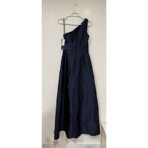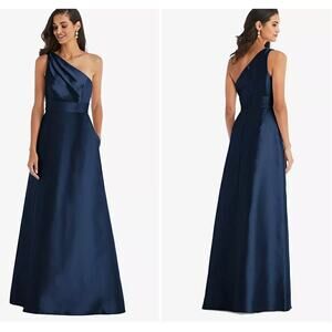 NWT Alfred Sung Draped One Shoulder Satin Maxi Dress Formal Midnight Navy