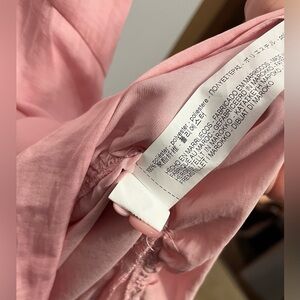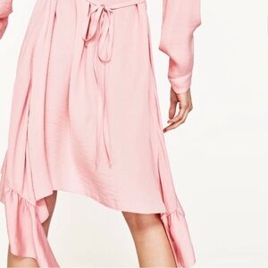 An amazing dress on its own or layered over/under other pieces, this pink silky dress from Zara features a flounce asymmetric hem, optional waist tie, long sleeves with button for cuffing, loop button closure at neck, and a midi length. Never worn, with tags, and in excellent condition.