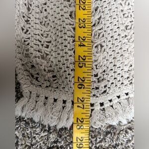 Umgee women’s natural colored linens blend Boho style loose fit open cardigan with crochet lace detail and fringe hemline.