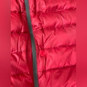 There was a small rip which I repaired with a down coat repair patch. Before and after shown. A small stain on front too. Not visible unless you’re looking for it but I wanted to point it out. Red with grey trim and interior. Front zip, zipped pockets. Stylish red puffer vest by Eddie Bauer. Features zippered pockets and a sleek design. Perfect for layering. Packable