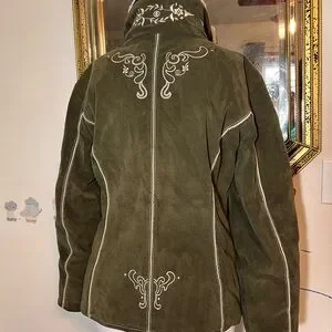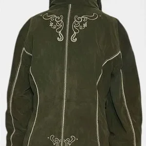 Elegant olive green ski jacket by Bogner. Features intricate white embroidery. Ideal for winter sports.