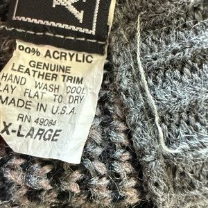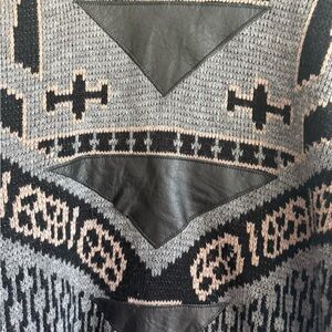 Good vintage condition. Sweater does have two holes on bottom of sleeve as shown in photo. You could stitch these back if you wanted. There is also a spot where the leather triangle stitching has come undone. You can still wear the sweater as is or stitch it back up.