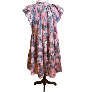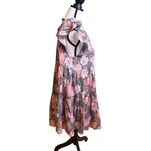Chic floral dress with ruffle sleeves. Features a mix of pink and gray colors.