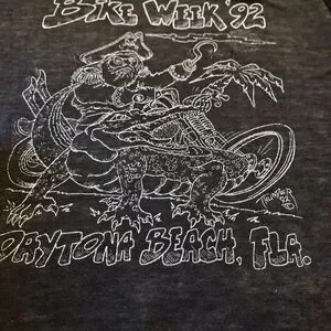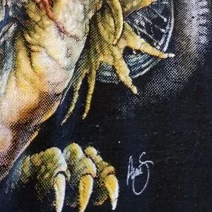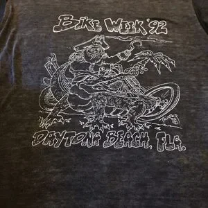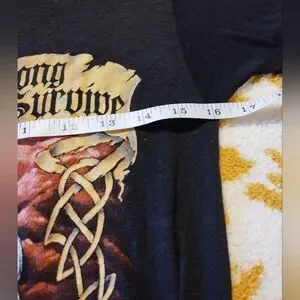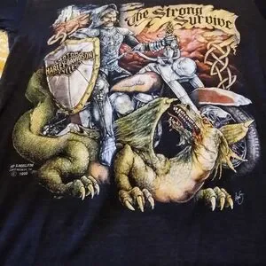 Bold graphic " The Strong Survive". Features a knight , Harley and Dragon. The size tag is completely faded so by the looks of it, it would probably be a size small to medium. This item has a few pinholes and are shown in pics. Really good shape for the age.Very thing material.