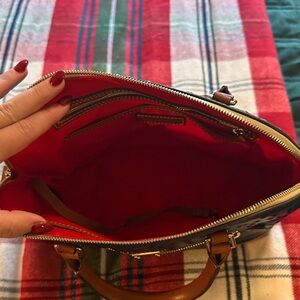 Chic and versatile satchel by Dooney & Bourke. Features a stylish blue and brown design. Perfect for everyday use. Does not come with crossbody straps. It is in perfect condition. No stains or scratches.