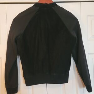 Stylish black, suede, bomber jacket by MICHAEL Michael Kors. Features gold zipper and front pockets. Ideal for any occasion.