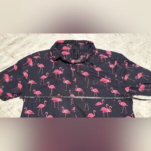 Add a touch of fun to your wardrobe with this black shirt featuring vibrant pink flamingos. Perfect for casual outings.