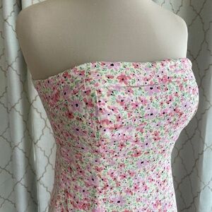 Charming strapless dress with a floral pattern. Features pink, green and a touch of yellow on a white background.