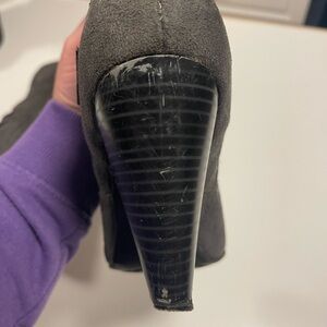 Elevate your wardrobe with these chic gray suede heeled boots. Featuring a stylish buckle detail, they are perfect for adding a touch of elegance to any outfit. Please see last few photos for some wear and tear-otherwise in good condition.