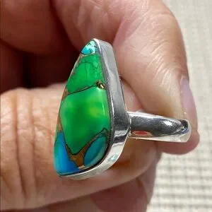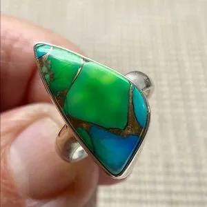 This stunning silver ring features a vibrant green and blue stone, perfect for adding a touch of elegance to any ensemble.