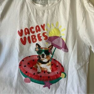 Fun and playful George kids graphic tee, size Large (10/12). White short sleeve shirt with a colorful “Vacay Vibes” design featuring a dog in sunglasses lounging on a watermelon floaty under the sun. Made of 100% cotton, lightweight and breathable—perfect for summer, vacation, or everyday wear. Measurements included in photos.