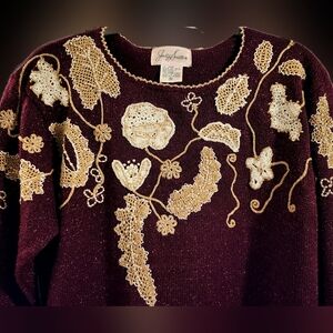 Elegant burgundy sweater. Features intricate gold leaf and floral designs. Perfect for a stylish look.
