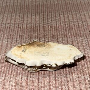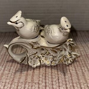 This vintage Napco salt and pepper shaker set features perched birds and an original label dating back to 1951.The white ceramic shakers were made in Japan and includes a base and 2 shakers. They are perfect for collectors or for adding a unique touch to your kitchen. The set features 2 nesting bird shakers in a soft white with gold details and is branded by Napco. The shakers are great for seasoning your favorite dishes and are a must-have for any collector. The base measures 5" wide and 1 1/2" deep. The shakers measure 4" from beak to tail. No chips or cracks but crazing from age. Shakers are missing the bottom stoppers .Please see pictures for details.