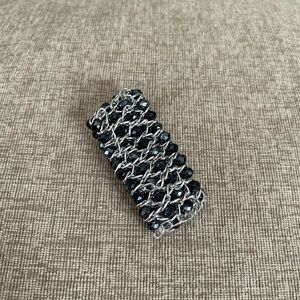 Jet black glass beads woven into silver chain cuff that stretches to fit the wrist, super sparkly and great for dressing up or down