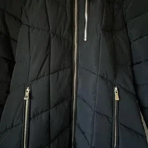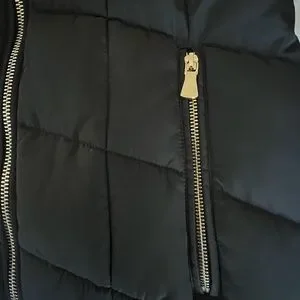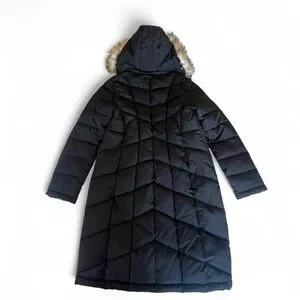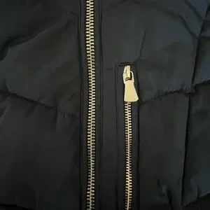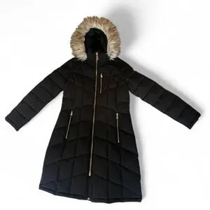 Stay warm and stylish with this black puffer coat featuring a luxurious fur trim. Perfect for chilly days.