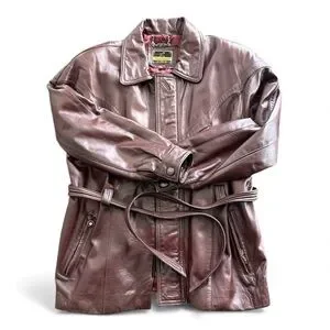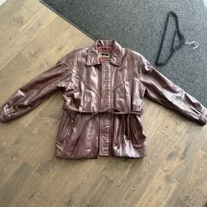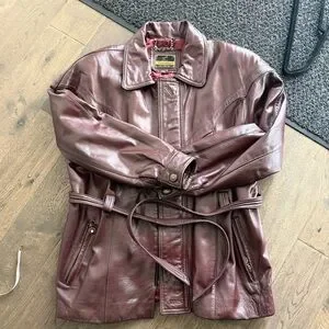 Stylish burgundy leather jacket featuring a belted waist and zippered pockets.
