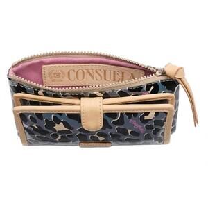 This slim wallet offers a stylish and practical way to keep everyday essentials organized. Designed with a patterned cloth exterior and natural leather trim, it combines durability with a refined touch. A secure snap closure keeps everything in place, while the thoughtfully designed interior includes a full-length zipper compartment, 12 card slots, an ID window, and four slide pockets for easy organization. Measuring approximately 6" W × 4" H × 1" D, this compact wallet delivers both functionality and sleek everyday style.