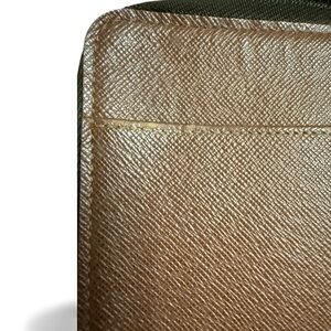 Pre-loved vintage condition. Exterior monogram canvas looks good with no cracks. Interior shows wear—rubbing, peeling in pockets, and marks inside the coin compartment (see all photos). Zipper works smoothly. Hardware shows normal vintage tarnish.