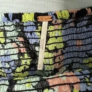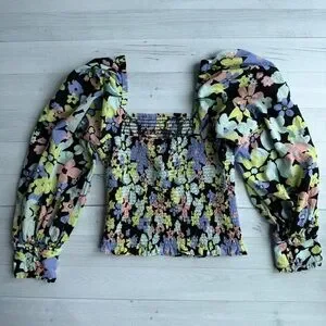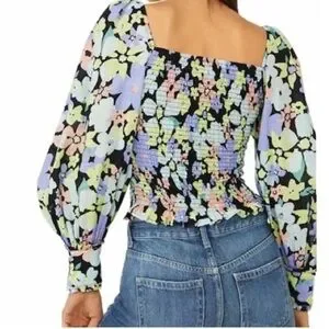 Free People Ariana Floral Print Puff Sleeve Top Size S. This stylish floral puff sleeve top features a vibrant mix of colors, perfect for any occasion. The design offers a flattering fit and a trendy look with a linen type texture. Can we worn on or off the shoulders.