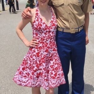 Red White Floral Sundress Fits Size 4 Halter Fit and Flare Y2K Summer Cottagecore