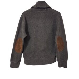 Stylish gray sweater with shawl collar. Features button details and elbow patches.