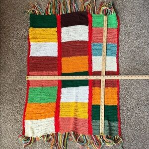 Vibrant crochet blanket featuring red, orange, yellow, green, and white blocks with fringe detailing. Hippy. Grandma. Baby Blanket