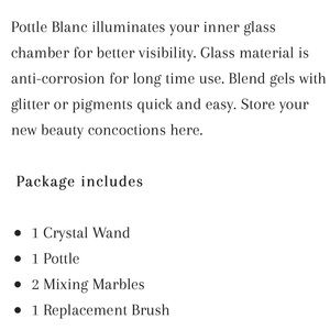 Includes tall chrome full hand twist applicator cap, rose gold strong midi-cap for joining members. Weighted durable glass base holds 20ml. 4” crystal wand for mixing and blending. Two copper mixing marbles. Interchangeable applicator.