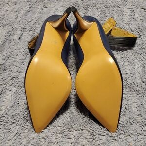 Stylish Coach heels in black and blue. Perfect for any occasion. Strap goes around the ankle. See pics for peeling on the inside of the shoe amd on inside of the ankle strap, other then that good condition. Size 8.5.