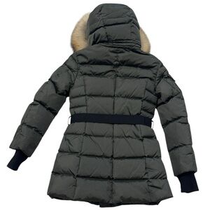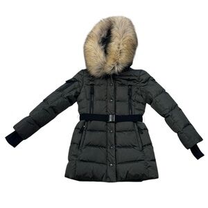 SAM.***Long Olive Green Belt Puffer Jacket Hooded w/Fur Trim***Size 10 $495 EUC