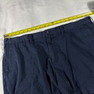 Great condition, rugged material, 100% cotton, dark navy blue color, flat front, zipper fly, button closure, smalll Polo tag on rear pocket, 6" inseam 41" waist (actual measurements pictured), pressed from professional dry cleaning