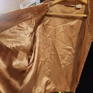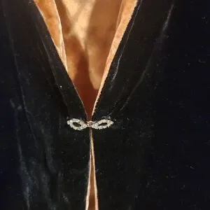 Vintagr velvet black blazer with tan collar and cuffs. Soft and stylish design.