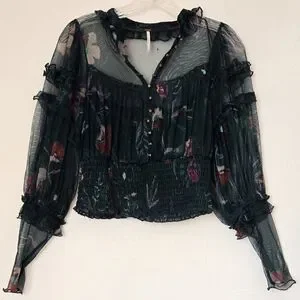 Time for Shine blouse from Free People in women's size small (shown on a size xs/s). Emerald green with floral print, long sleeves, functional buttons, and a smocked bottom. Soft mesh body with ruffles just below shoulders and elbows. Perfect for a subtle and chic holiday look. Retails for $88. In like-new condition with no stains, tears, or pilling found. From a smoke-free home and open to questions, offers, and discounted bundles.