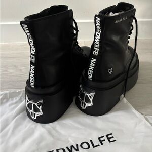 Elevate your look with these bold black platform ankle boots by Naked Wolfe. Perfect for making a statement.