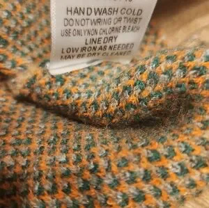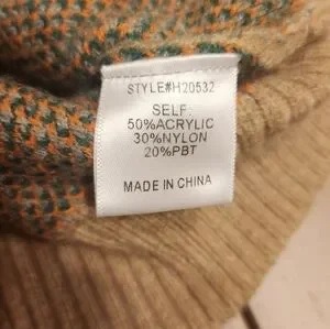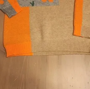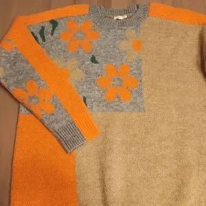 Stylish crew neck sweater with orange, gray, and tan floral patchwork design. Perfect for a cozy look. 50% polyester, 30% acrylic, 20% pbt.