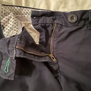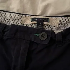 Step up your warm weather wardrobe. Classic navy blue Tommy shorts. Perfectly preppy 5-inch inseam. Front button and zipper with additional inside trouser button.